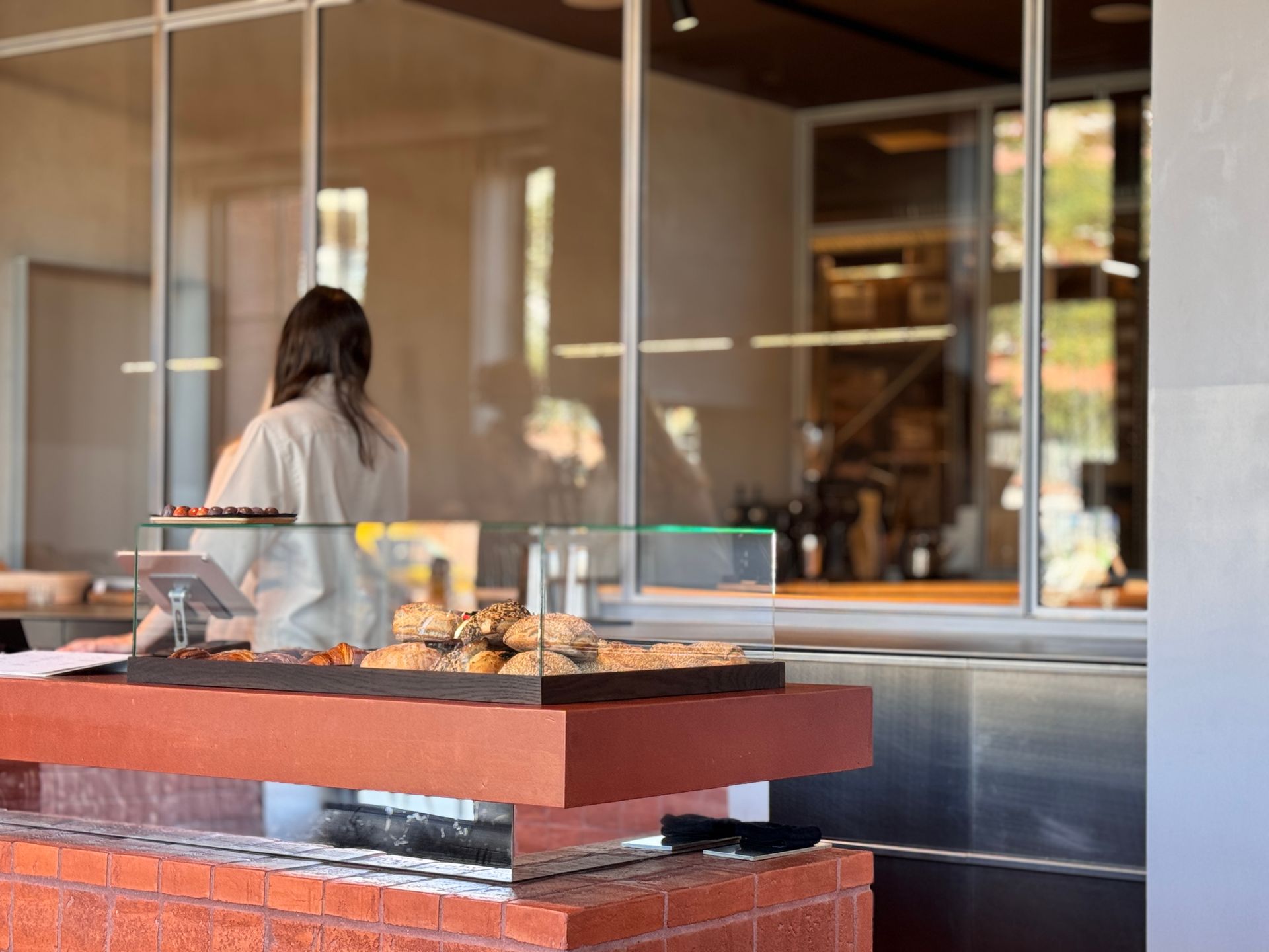 An ultra stylised brick and concrete space, with roastery behind and shelves swollen with retail goods, the vibe is very much instagram afficionados.