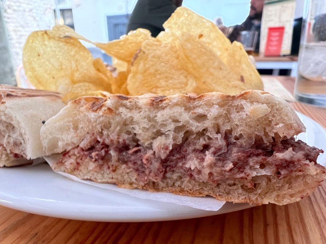 Out came a plate of 2x2 little sandwiches and a pile of potato chips in the middle. I started with the Mechada and found it tasty but a tad dry. The Spanish (like the Portuguese) are not rabid for condiments, pickles, relishes, sauces or butter. They like their bread plain (splash of oil) with a lump of something sat ontop. Fair play, but in most instances I think their cuisine would be elevated up a huge notch with a tiny bit of something acidic to cut through the heavy meat-factor. However, who am I to comment on a national cuisine.