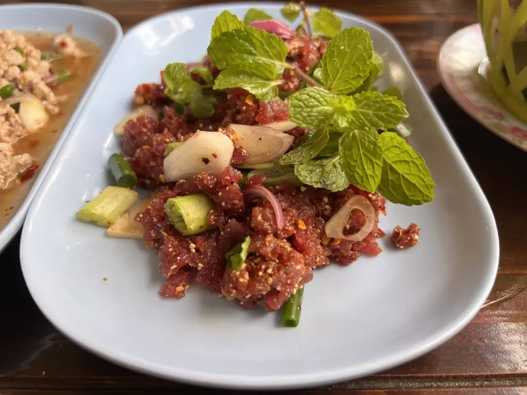 Sipping excellent coffee at Asama, the barista mentioned that we should go to this restaurant in the old town to eat Larb. I made a note of it on google maps, double-checking with her that it was correct. A couple of days passed and we happened to be in the area, following the prompts until we stood outside, slightly puzzled.