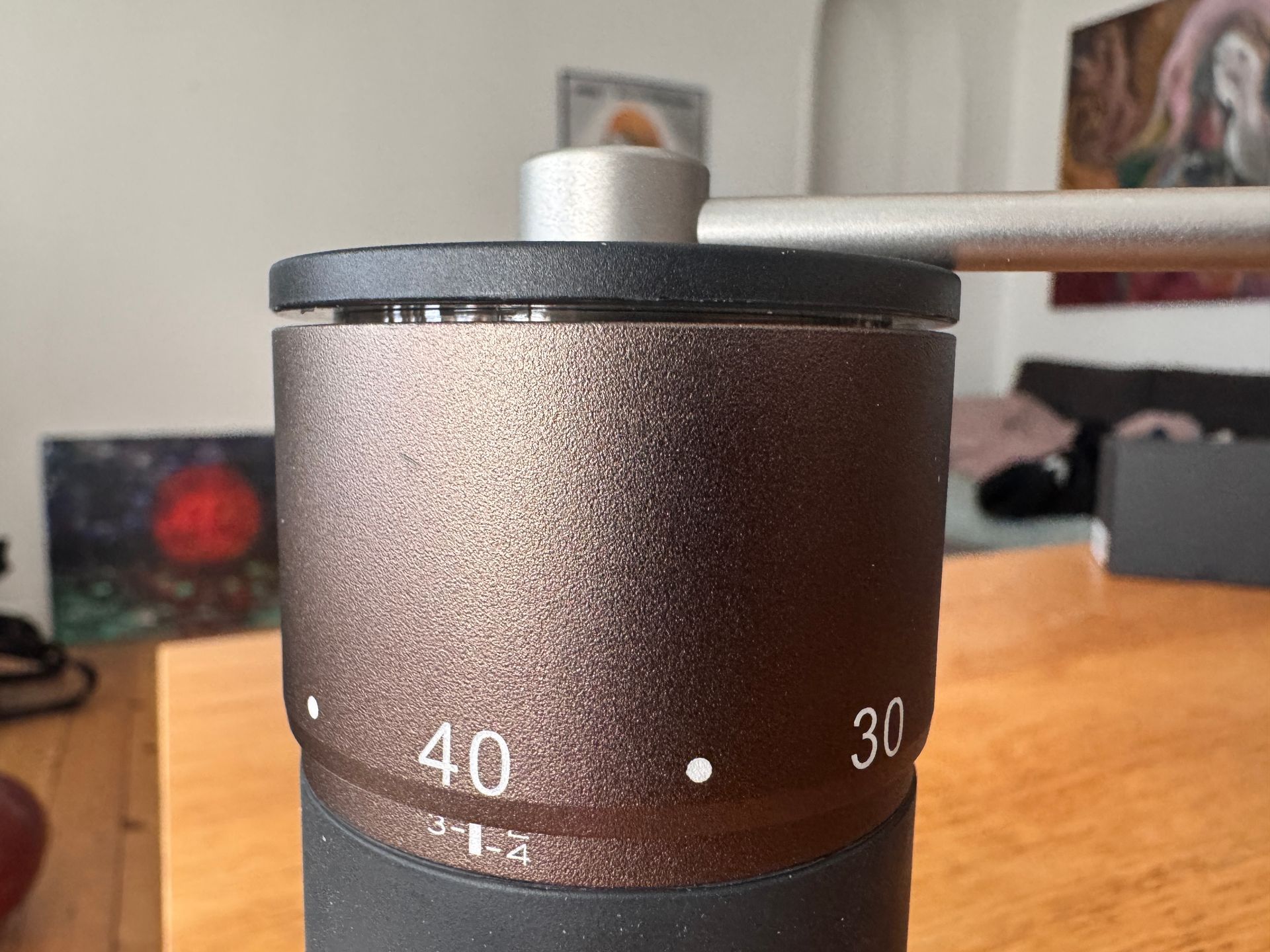 - Solid build. The aluminium body, stainless burrs, and overall heft (~630 g) feel solid in hand. Machining quality is better than you’d expect at this price point.