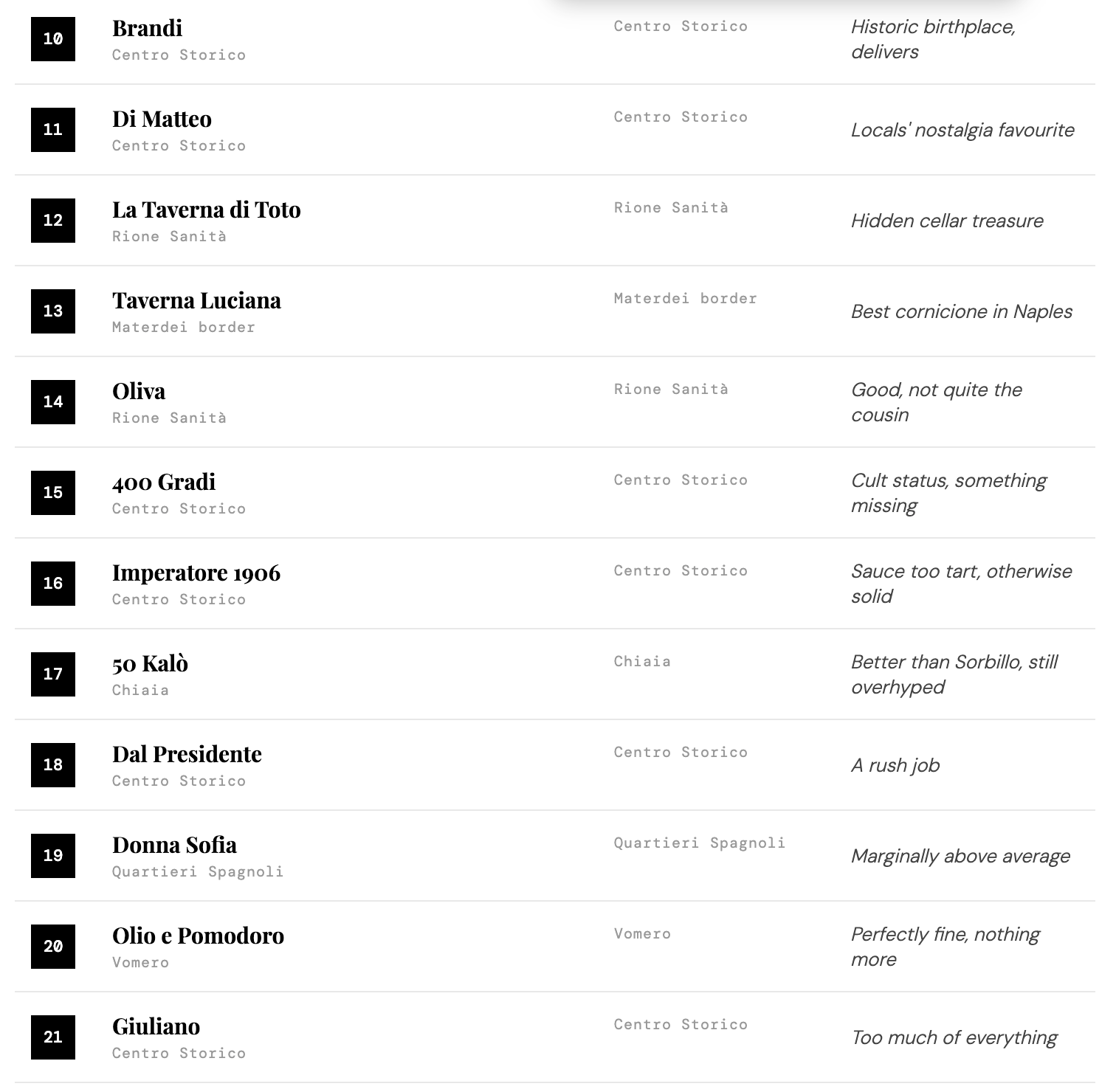 I realise there is a certain amount of scandalous entitlement to place such a famous pizzeria so low on the totem pole, but by golly these guys have pulled the wool over all of your eyes. Mediocrity is a compliment. This behemoth of a pizza restaurant heaves from an incessant tide of idiotic tourists standing in line for the most bland, boring pizza in Naples. Ok, it is not quite THAT bad, but there is very little to be excited about. The base is the crepe-like version with zero salt, the sauce is insipid, the cheese too remains rather tasteless, and the whole operation just smells of money making.