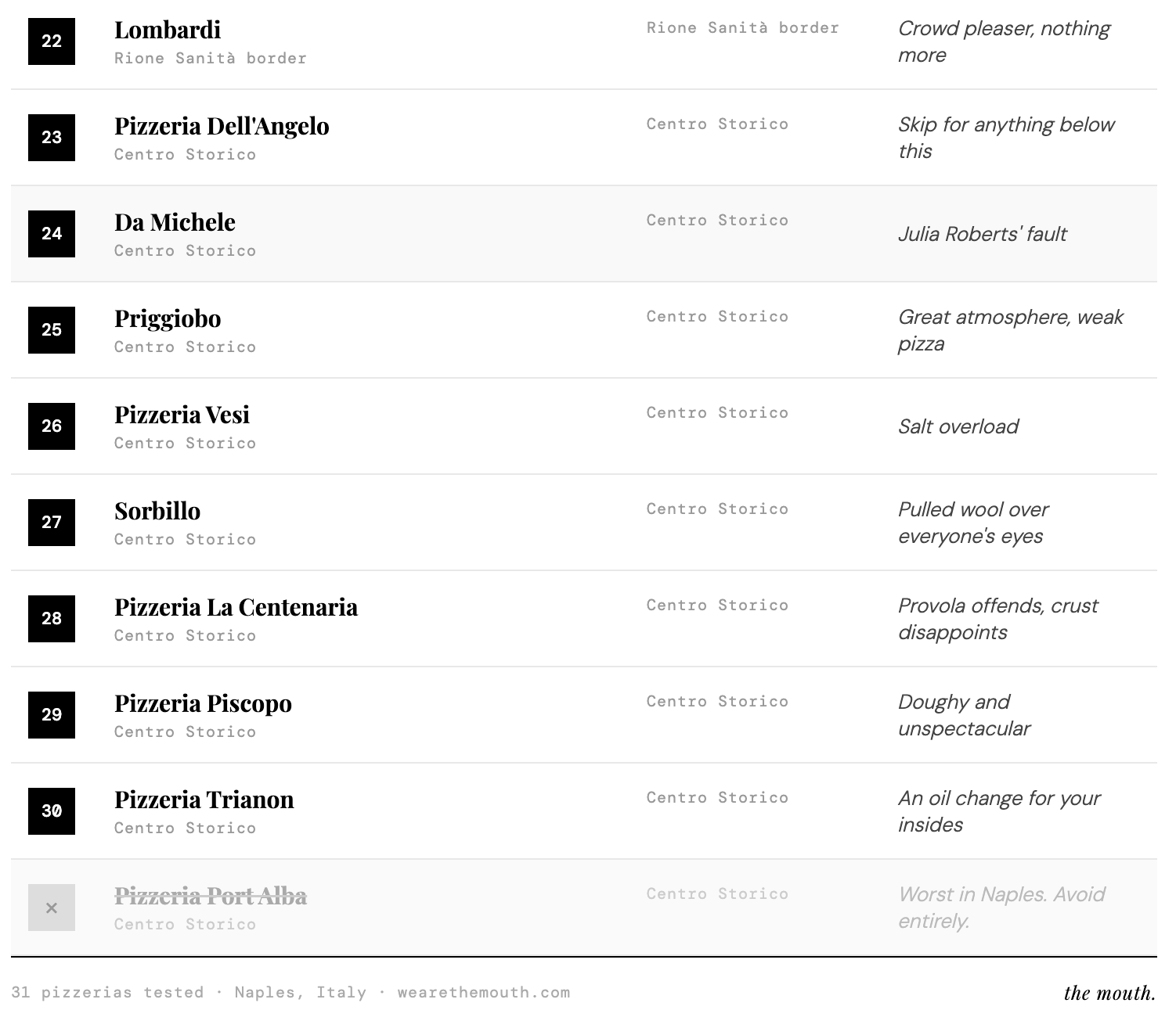 Laid out below is a list of all 31 pizzeria's, photographs of the pizza from above and below, and a short explanation as to what I thought. In the true spirit of anticipation, the worst shall be first, and if you want to avoid reading a long diatribe, just scroll to the bottom to find out which one reigned supreme. The journey was hard on my stomach, piling on kilo's even after walking miles per day, but it was worth it. The difference between the best one to the worst was gargantuan. Almost like comparing a canned mushroom to a freshly picked one. However, the differences between the top 5-10 were minor, and it came down to the age-old principal of "Which one would I eat again?".