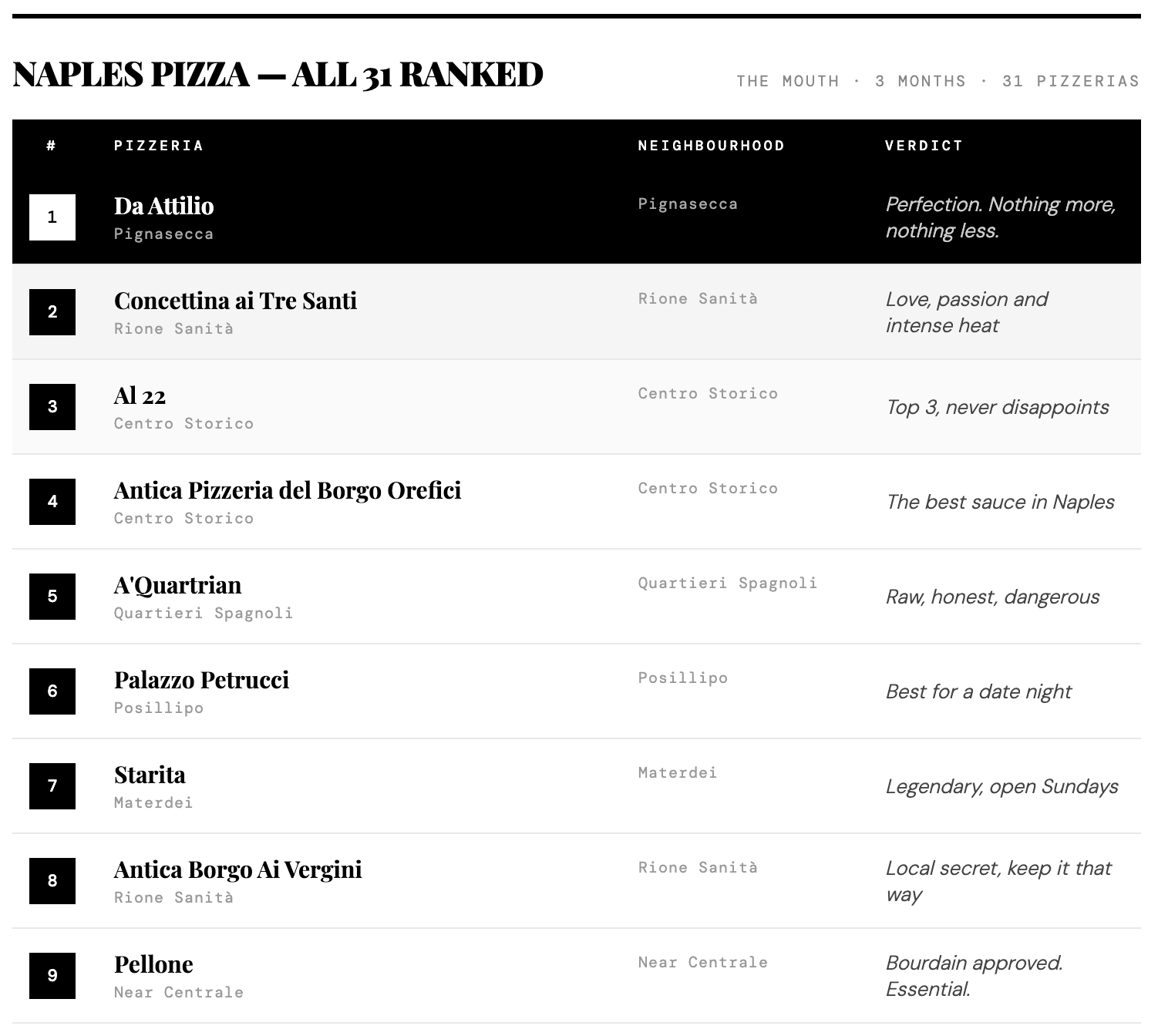 The best pizza in Naples is at Da Attilio in the Pignasecca market area. After tasting pizza at 31 of Naples' most recommended pizzerias over three months, The Mouth found Da Attilio's Margherita to be the most perfectly balanced — sauce, cheese, crust and heat in complete harmony. Concettina ai Tre Santi (Rione Sanità) is a close second. Avoid Sorbillo despite its fame - An overhyped tourist trap, according to this guide.